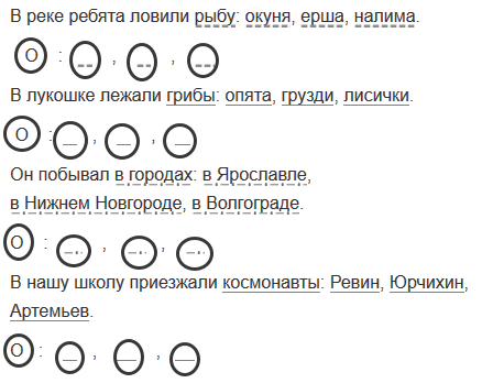1) В реке ребята ловили рыбу: ... . 2) В лукошке лежали грибы: ... . 3) Он побывал в городах: ... . 4) В нашу школу приезжали космонавты: ... .