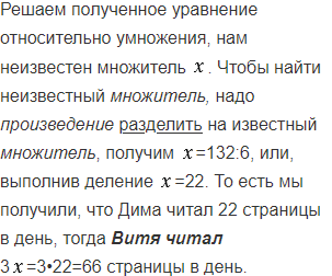 стр. Так как Витя догнал Диму через 3 дня, при этом Дима прочитал уже 132 страницы, а значит, он за три дня прочитал на 132 страницы меньше Вити, поэтому мы можем записать следующее уравнение:
