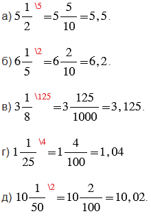 Чтобы преобразовать смешанные числа в десятичные дроби, используем основное свойство дроби, а именно, умножаем числитель и знаменатель дробной части смешанных чисел на такое число, чтобы в знаменателе получилась единица с нулями (10, 100, 1000). Затем, учитываем то, что после запятой стоит столько цифр, сколько нулей стоит в записи знаменателя соответствующей обыкновенной дроби.