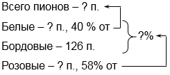 Все пионы (белые, розовые, бордовые) на клумбе составляют 100%. Белые пионы составляют 40% всех пионов, значит, розовые и бордовые составляют: