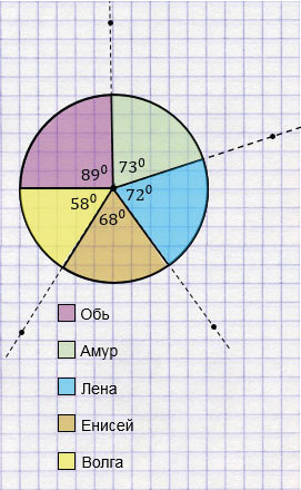 Чертим луч с началом в центре круга, который пройдет через отмеченную точку, получаем угол, равный 890, который приходится на сектор, соответствующий длине реки Обь (с Иртышом).