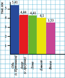 При построении стоит помнить, что столбцы должны иметь одинаковую толщину и находится на одинаковом расстоянии. Построим столбец, соответствующий реке Обь (с Иртышом), выбрав ширину 1 см. Так как ее длина равна 5,41 тыс км, то высота столбца должна быть равна 5,41 см.
