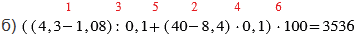 б) ((4,3 - 1,08) : 0,1 + (40 - 8,4)•0,1)•100.