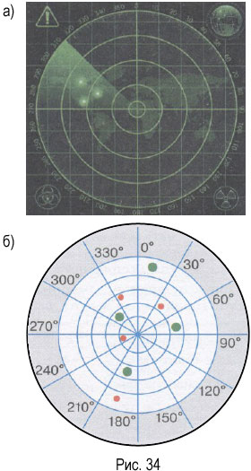 На круглом экране радара отмечены окружности, радиусы которых соответствуют 200, 150, 100 и 50 км (рис. 34, б). Центр окружностей - аэропорт, зелёные точки на экране - вылетевшие самолёты, красные - прилетающие. Угол между соседними лучами равен 300. Опишите примерное местоположение каждого прилетающего самолёта по схеме: