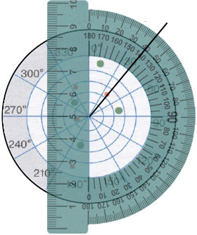 Для определения угла между направлением на самолёт и нулевым направлением расположим транспортир следующим образом: