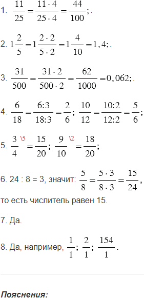 2) Чтобы преобразовать обыкновенную дробь в десятичную, используем основное свойство дроби, для этого умножаем числитель и знаменатель на такое число, чтобы в знаменателе получилось 10, 100 или 1000.