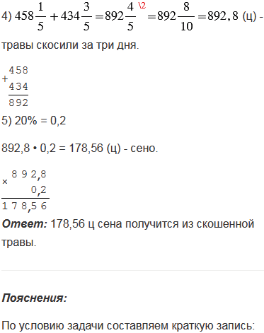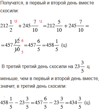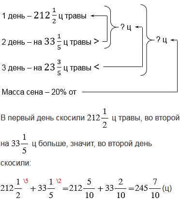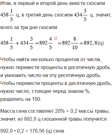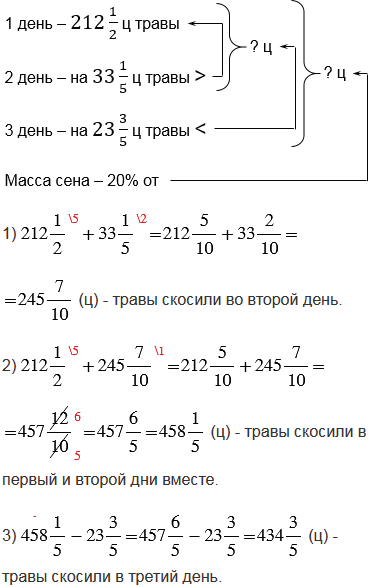 В первый день скосили ц травы, во второй - на ц больше, а в третий - на ц меньше, чем в первый и второй день. Сколько получится сена из скошенной травы, если масса сена составляет 20% массы травы?