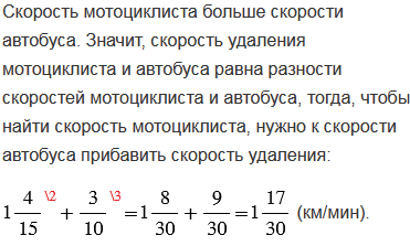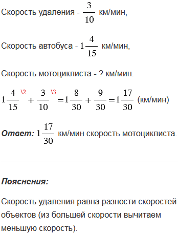Мотоциклист обогнал автобус и удалился от него со скоростью км/мин. С какой скоростью двигался мотоциклист, если скорость автобуса км/мин?