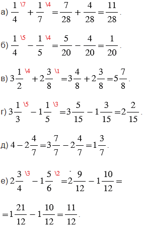 4) чтобы найти сумму смешанных чисел, надо: дробные части этих чисел привести к наименьшему общему знаменателю; отдельно выполнить сложение целых и отдельно дробных частей; при необходимости сократить дробь (разделить числитель и знаменатель дроби на их наибольший общий делитель), выделить целую часть (когда числитель больше знаменателя) и прибавить ее к полученной целой части;