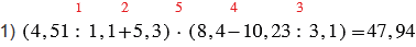 1) (4,51 : 1,1 + 5,3) • (8,4 - 10,23 : 3,1);