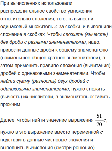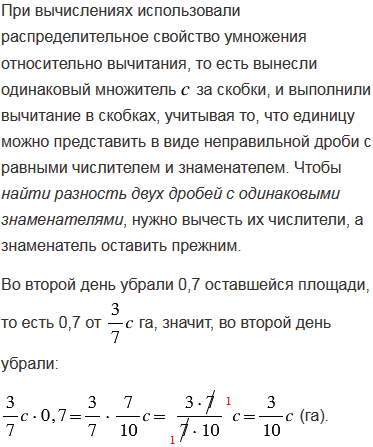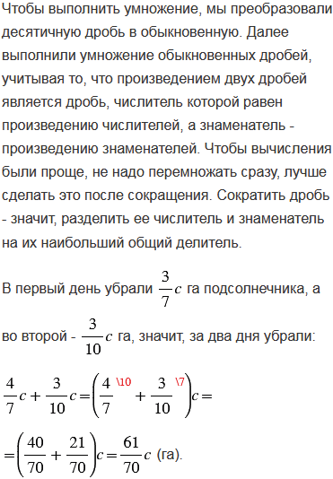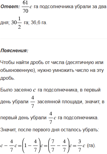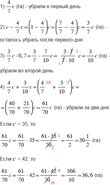 В первый день убрали площади, засеянной подсолнечником, во второй день - 0,7 оставшейся площади. Сколько гектаров подсолнечника убрали за эти два дня, если было засеяно га? Найдите значение получившегося выражения при = 35; = 42.