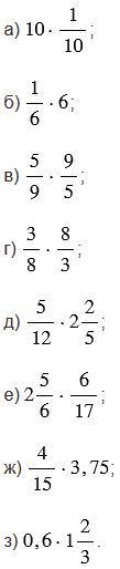 .В пунктах д) - з), чтобы найти произведение, преобразуем смешанные числа в неправильные дроби, и если возможно сокращаем их, а десятичные дроби в обыкновенные дроби и также, если возможно сокращаем их.