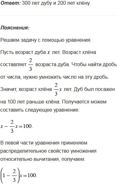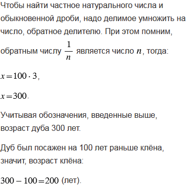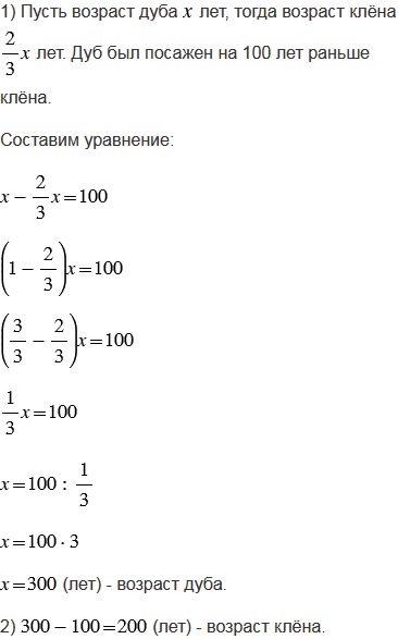 В летнем саду Санкт-Петербурга дуб был посажен на 100 лет раньше клёна. Сколько лет каждому дереву, если возраст клёна составляет возраста дуба?