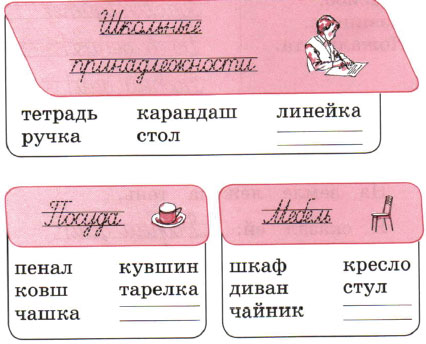 Стол не относится к школьным принадлежностям. Пенал не является посудой. Чайник не относится к мебели.