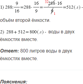 Для полива огорода наполнили две ёмкости. Вместимость одной ёмкости составляет вместимости другой и равна 288 л. Сколько литров воды в двух ёмкостях вместе?
