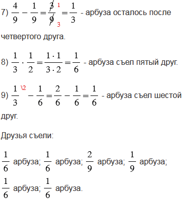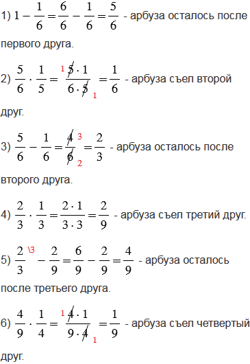 Шестеро друзей по очереди ели арбуз. Первый съел шестую часть арбуза, второй - пятую часть остатка, третий - треть того, что оставил второй, четвертый - четверть нового остатка, пятый - половину того, что оставил четвертый, а шестой доел остатки арбуза. Кто из друзей съел больше всех?
