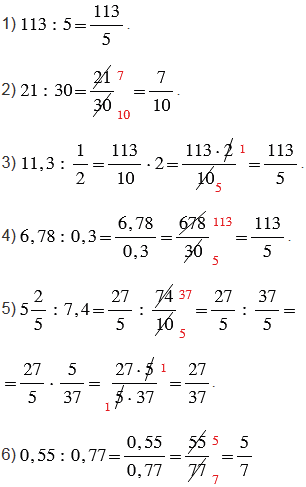 Найдите равные отношения чисел: 113 к 5; 21 к 30; 11,3 к ; 6,78 к 0,3; к 7,4; 0,55 к 0,77.