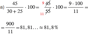 Ответ: 81,8% составляет площадь, убранная первым отрядом, от площади, убранной двумя другими отрядами.