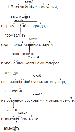 Выслуш..ые замечания, в промасл..ой одежде, около подстрел..ого зайца, в увеш..ой картинами галерее, по вымощ..ой булыжником улице, на усе..ой сосновыми иголками земле, в замеш..ом тесте.