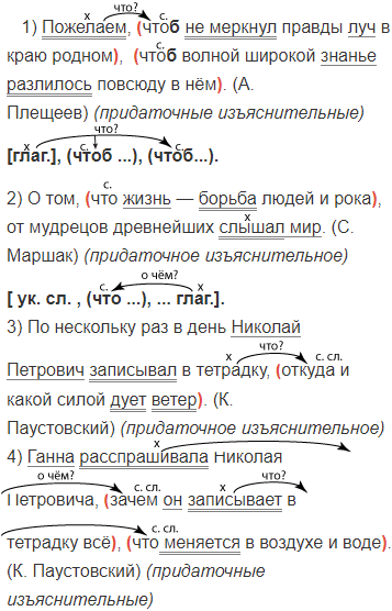 1) Пожелаем, (чтоб не меркнул правды луч в краю родном), (чтоб волной широкой знанье разлилось повсюду в нём). (А. Плещеев) (придаточные изъяснительные)