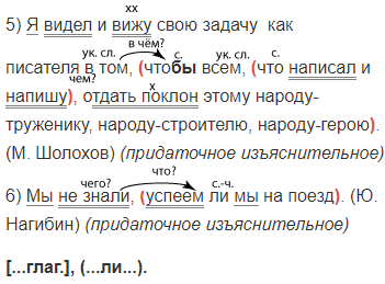 1) Пожелаем что(б) не меркнул правды луч в краю родном что(б) волной широкой знанье разлилось повсюду в нём. (А. Плещеев) 2) О том что жизнь борьба людей и рока от мудрецов древнейших слышал мир. (С. Маршак) 3) По нескольку раз в день Николай Петрович записывал в тетрадку откуда и какой силой дует ветер. (К. Паустовский) 4) Ганна расспрашивала Николая Петровича зачем он записывает в тетрадку всё что меняется в воздухе и воде. (К. Паустовский) 5) Я видел и вижу свою задачу как писателя в том что(бы) всем что написал и напишу отдать поклон этому народу труженику народу строителю народу герою. (М. Шолохов) 6)Мы не знали успеем ли мы на поезд. (Ю. Нагибин)