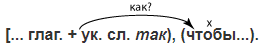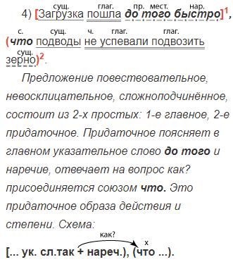 4) Загрузка пошла до того быстро, (что подводы не успевали подвозить зерно). (С. Антонов) (степень) 5) Удар был так быстр и внезапен, (что Буланин сразу сел на пол). (А. Куприн) (образ действия, причина) 6) Речка так блестит и сверкает на солнце, (что глазам больно). (И. Гончаров) (образ действия, причина, степень) 7) Наступление шло так, (как было предусмотрено в штабе). (В. Арсеньев) (образ действия)
