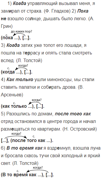 1) Когда управляющий вызывал меня я зам..рал от страха. (Ф. Гладков) 2) Пока (не)взошло со..нце дышать было легко. (А. Грин) 3) Когда затих уже топот его лошади я пошла на т..расу и опять стала смотреть вслед. (Л. Толстой) 4) Как только ушли миноносцы мы стали ставить палатки и соб..рать дрова. (В. Арсеньев) 5) Разошлись по домам после того как отряд остановился в центре города и начал разм..щаться по квартирам. (Н. Островский) 6) В то время как я вздр..мнул взошла луна и бросала сквозь тучи свой холодный и яркий свет. (Л. Толстой) 7) Очнулся он когда солнце стояло уже высоко. (А. Гайдар) 8) Они проснулись когда в избе было совсем светло. (А. Гайдар) 9) В то время как товарищ мой остановился м..лькнула перед моими глазами большая бабочка. (С. Аксаков) 10) Был Яков очень нервен и особенно тогда когда доходило дело до его сем..и х..зяйства. (И. Бунин)
