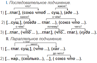 II. Параллельное подчинение. 1) Я спросил сегодня у менялы1, что даёт за полтумана по рублю2, как сказать мне для прекрасной Лалы по-персидски нежное «люблю»3. 2) Или снова1, сколько ни проси я2, для тебя навеки дела нет1, что в далеком имени — Россия — я известный, признанный поэт3. 3) И потому1, что я постиг всю жизнь, пройдя с улыбкой мимо2, я говорю на каждый миг1, что всё на свете повторимо3.