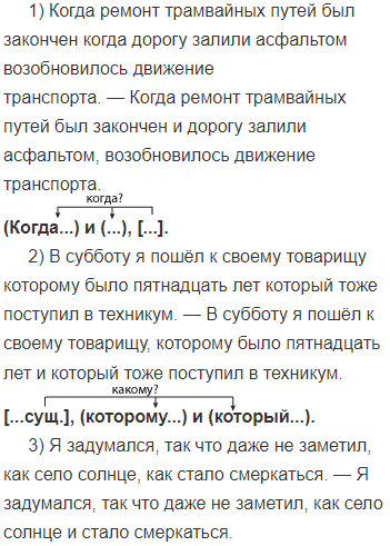 1) Когда ремонт трамвайных путей был закончен когда дорогу залили асфальтом возобновилось движение транспорта. 2) В субботу я пошёл к своему товарищу которому было пятнадцать лет который тоже поступил в техникум. 3) Я задумался так что даже не заметил как село солнце как стало смеркаться. 4) Альпинисты подошли к лагерю где был назначен сбор всех отрядов откуда должно было начаться восхождение на Эльбрус. 5) Бывает такая музыка, которая волнует душу, которая возвышает её.
