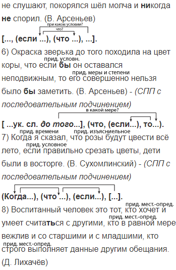 1) Раз гуляя по лесу я забрёл так далеко что чуть(чуть) не заблудился но к счастью наконец набрёл на тропку которая привела меня к морю где я сейчас(же) мог ориентироваться. (Н.Миклухо-Маклай) 2) Пока я записывал и рисовал виденное мои спутники усердно кричали что(бы) вызвать кого(нибудь) с плантаций. (Н. Миклухо-Маклай) 3) Ей становилось тяжело (от)того что настроение всех окружающих было так далеко (от)того что было в её душе. (Л. Толстой) 4) Он о чём(то) всё время думал (и)так был занят своими мыслями что когда его спрашивали о чём(нибудь) то он вздрагивал встряхивал головой и просил повторить вопрос. (А. Чехов) 5) Он [Дерсу] считал своим долгом предупредить об угрожающей опасности и если видел что его не слушают покорялся шёл молча и (ни)когда (не)спорил. (В. Арсеньев) 6) Окраска зверька до того походила на цвет коры что если(бы) он оставался неподвижным то его совершенно нельзя было(бы) заметить. (В. Арсеньев) 7) Когда я сказал что розы будут цвести всё лето если правильно срезать цветы дети были в восторге. (В. Сухомлинский) 8) Воспитанный человек это тот кто хочет и умеет счита(т, ть)ся с другими кто в равной мере вежлив и со старшими и с младшими кто строго выполняет данные другим обещания. (Д. Лихачёв)