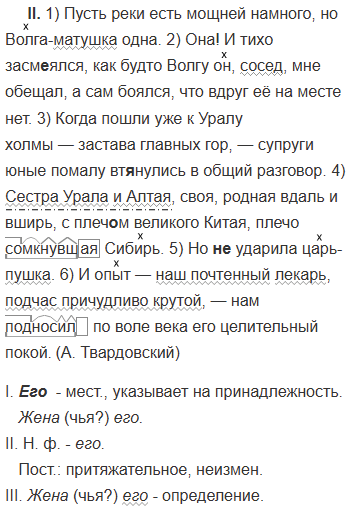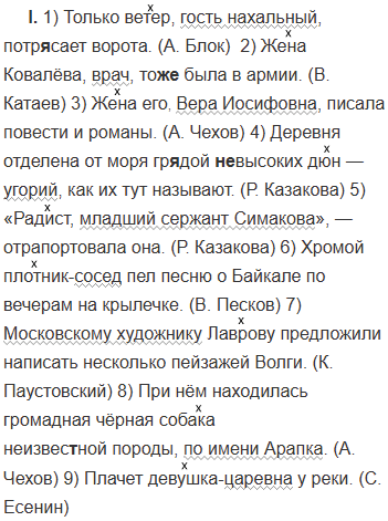 I. 1) Только ветер гость нахальный потр..сает ворота. (А. Блок) 2) Жена Ковалёва врач то(же) была в армии. (В. Катаев) 3) Жена его3 Вера Иосифовна писала повести и романы. (А. Чехов) 4) Деревня отделена от моря гр..дой (не)высоких дюн угорий как их тут называют.4 (Р. Казакова) 5) Радист младший3 сержант Симакова отрапортовала она. (Р. Казакова) 6) Хромой плотник сосед пел песню о Байкале по вечерам на крылечке. (В. Песков) 7) Московскому художнику Лаврову предложили написать несколько3 пейзажей Волги. (К. Паустовский) 8) При нём находилась громадная чёрная собака неизвес..ной3 породы по имени Арапка. (А. Чехов) 9) Плачет девушка царевна у реки. (С. Есенин)