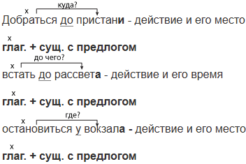 Добраться до (пристань), встать до (рассвет), остановиться у (вокзал), гулять по (аллея), приехать через (неделя), забыть по (рассеянность), кричать от (боль), книга для (чтение), идти (на)встречу (ветер), сидеть (во)круг костра, не явиться (из)за (болезнь), выглядывать (из)под (ветвь), броситься (на)перерез (зверь), задержаться (в)следстви.. (ураган), отсутствовать (в)течени.. месяца, знать благодаря (отец), выполнить согласно (решение), изменилась вопреки (предсказание).
