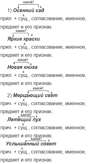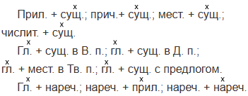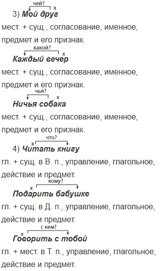 Составьте по три словосочетания, соответствующих каждой из приведённых ниже схем. Определите в каждом случае вид подчинительной связи (согласование, управление или примыкание), грамматическое значение словосочетаний (предмет и его признак; действие и предмет, на который оно переходит; действие и его признак и др.) Проведите разбор словосочетаний, следуя порядку разбора, указанному на с.242.