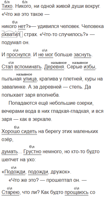 Человеку приснился сон. Идёт будто он берегом реки. Тихо. Никого ни одной живой души вокруг. Что же это такое — никого нет удивился человек. Человека охватил2 страх. Что-то случилось подумал он. И проснулся. И не мог больше заснуть. Стал вспоминать. Деревня. Серые избы пыльная улица крапива у плетней куры на завалинке3. А за деревней степь. Да полыхает6 заря вполнеба.
