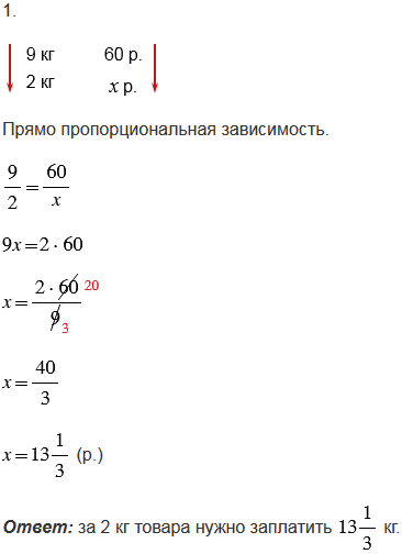 1. За девять килограммов товара заплатили шестьдесят рублей. Сколько надо заплатить за два килограмма товара?