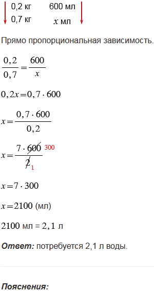 Для приготовления гарнира из 0,2 кг гречневой крупы нужно взять 600 мл воды. Сколько воды потребуется, чтобы приготовить 0,7 кг крупы?