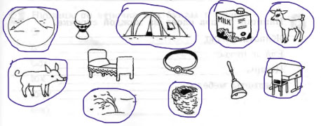 Названные предметы: hill (холм), tent (палатка), pig (свинья), wind (ветер), milk (молоко), kid (козлёнок), desk (парта), nest (гнездо).