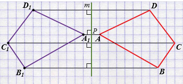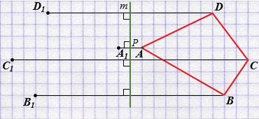 Для решения задачи проведем через точку А прямую под прямым углом к прямой . Эта прямая пересечет ось симметрии в точке Р. Отложим на прямой АР отрезок РА1, равный отрезку АР, по другую сторону от оси. Точка А1 симметрична точке А относительно прямой . Аналогично строим точки В1, С1 и D1, симметричные соответственно точкам В, С и D относительно прямой .