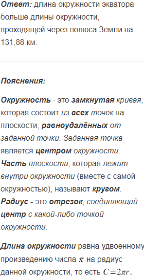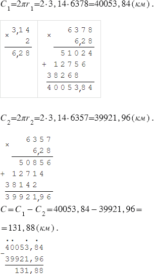 Экваториальный радиус Земли равен 6378 км, а полярный - 6357 км. На сколько длина окружности экватора больше длины окружности, проходящей через полюса Земли?