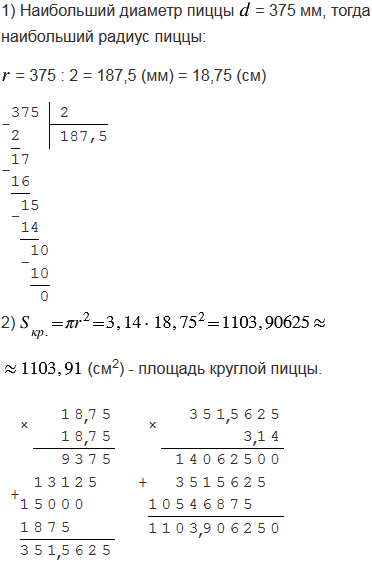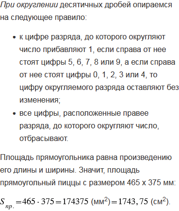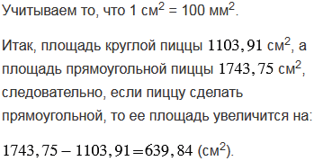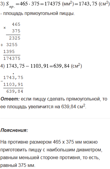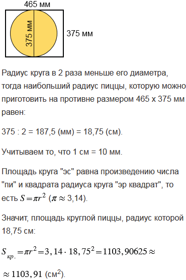 Какой может быть наибольший радиус пиццы, приготовленной на противне размером 465 х 375 мм? Найдите площадь этой пиццы. На сколько увеличится площадь пиццы, если ее сделать прямоугольной? Ответ округлите до сотых.