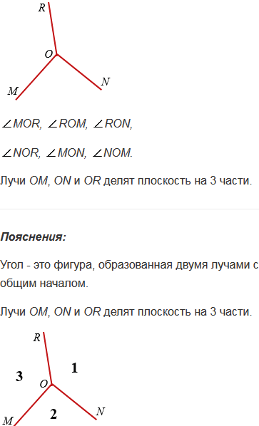 Проведите из точки О три луча: ОМ, ОN и ОR. Запишите шесть углов, которые образовали эти лучи. На сколько частей эти лучи делят плоскость?