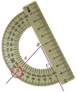 Прикладываем центр транспортира к вершине В угла АВС так, чтобы сторона ВС проходила через нулевое деление на внешней шкале транспортира.