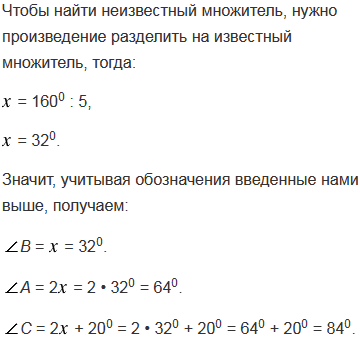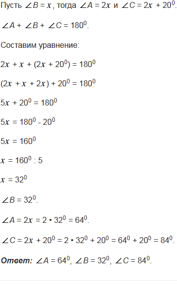 В треугольнике АВС угол А в 2 раза больше угла В и на 200 меньше угла С. Найдите три угла треугольника АВС.