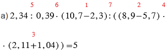 а) 2,34 : 0,39 • (10,7 - 2,3) : ((8,9 - 5,7) • (2,11 + 1,04));