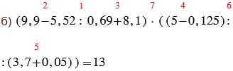 б) (9,9 - 5,52 : 0,69 + 8,1) • ((5 - 0,125) : (3,7 + 0,05)).