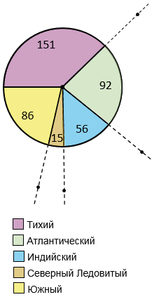 | Название океана | Площадь, млн км2 | Сектор диаграммы, градусы |