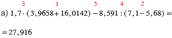 а) 1,7 • (3,9658 + 16,0142) - 8,591 : (7,1 - 5,68);