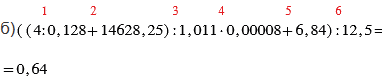 б) ((4 : 0,128 + 14628,25) : 1,011 • 0,00008 + 6,84) : 12,5.