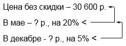 1) 30 600 : 100 • 20 = 306 • 20 = 6120(р.) - скидка 20% от исходной цены.
