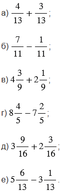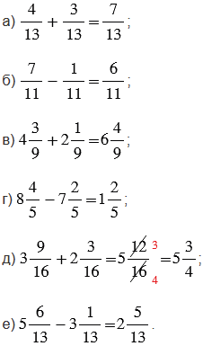 Чтобы найти сумму (разность) двух смешанных чисел, надо отдельно сложить (вычесть) их целые и дробные части.